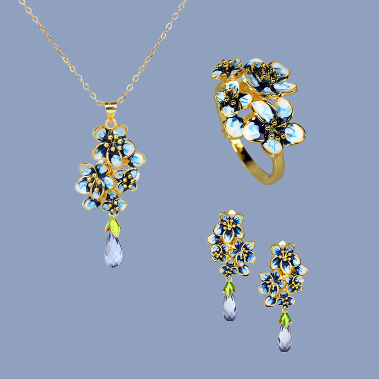 Ornament Three-piece Ring Set Inlaid With Water Drop Gem Necklace Ear Stud